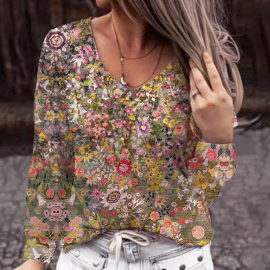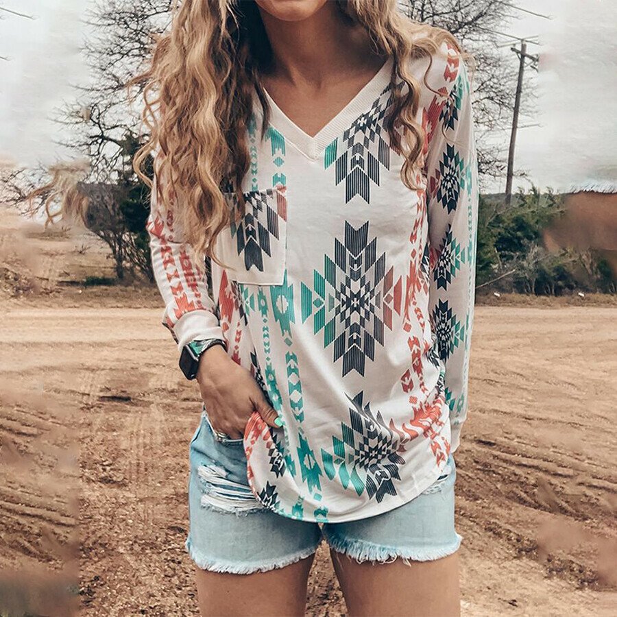 Ladies Retro V-Neck Printed Long Sleeve Top