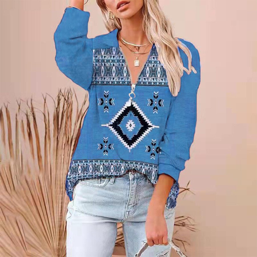 Ladies Retro V-neck Zipper Print Long Sleeve Sweatshirt