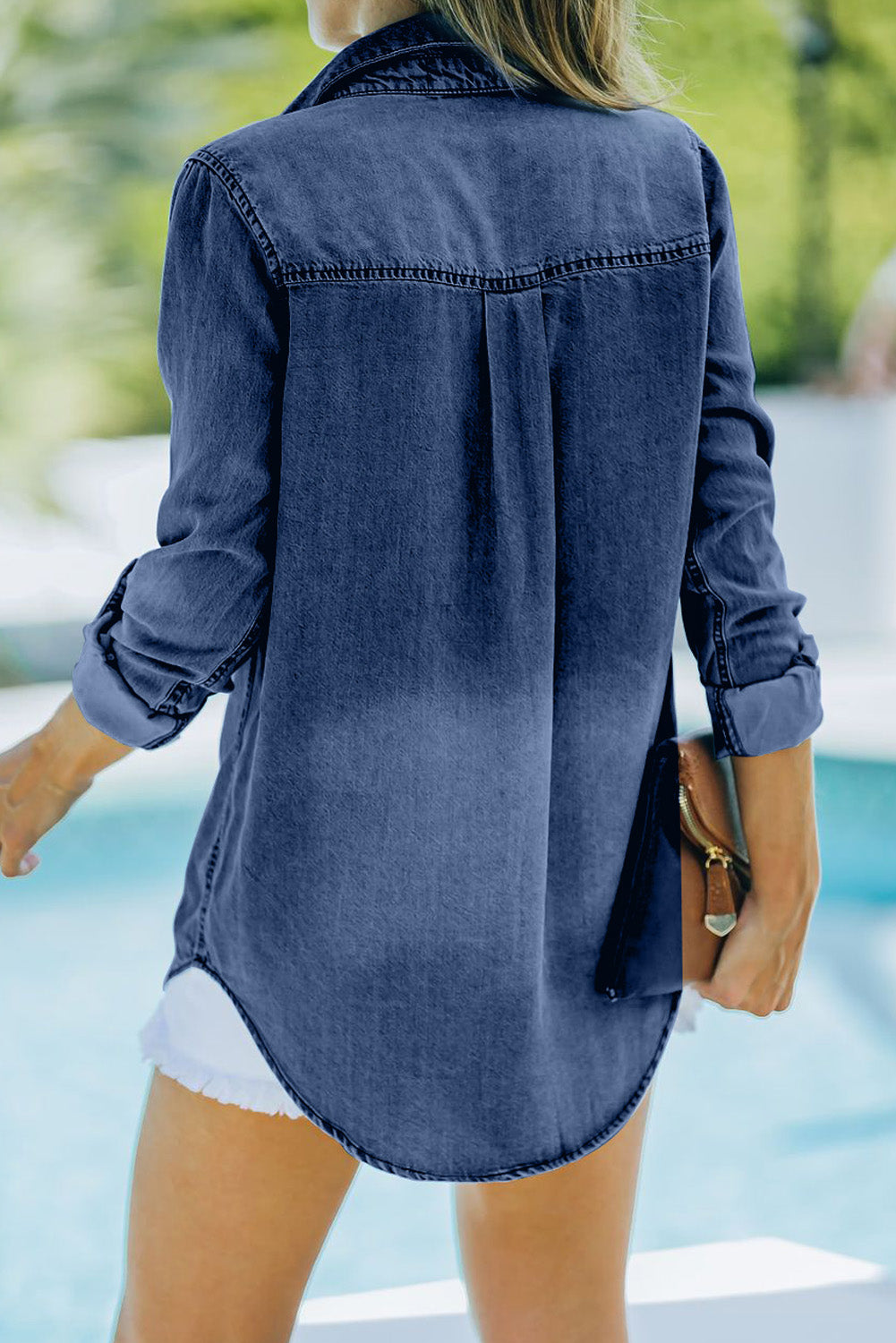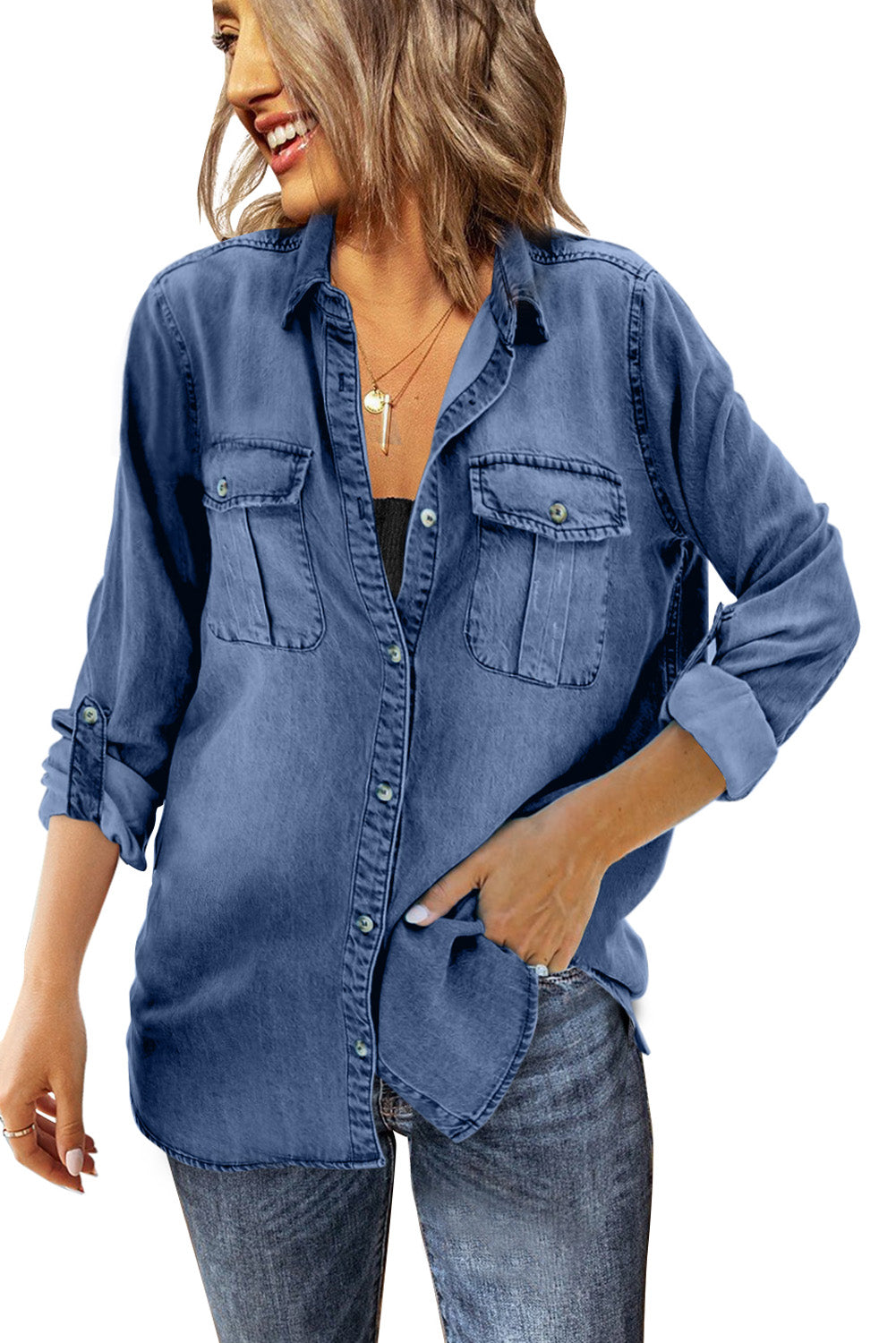 •Denim shirt with turn down collar and flip pockets is stylish