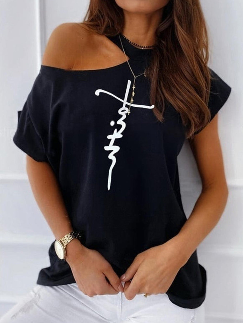 Features: Cold shoulder tops, Short sleeve faith t shirt, Graphic tees, Loose fitting style. Trendy womens summer tops. Perfect to pair with jeans, leggings and shorts.