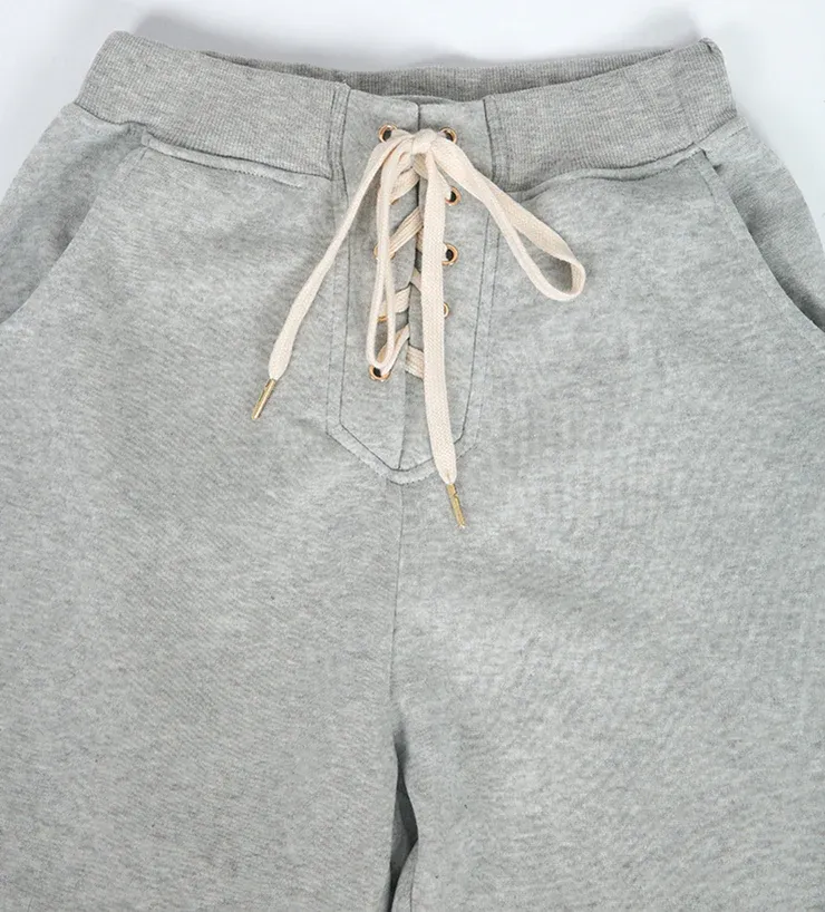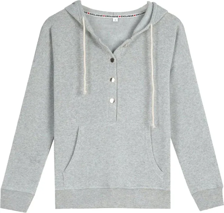 Loungewear gets an upgrade with this stellar heather grey set cute enough to wear all over town. A warm hoodie with golden snaps and a kangaroo pocket coordinates with slim sweatpants featuring a fashionable lace-up top and slant pockets. Layer it with a lace-trimmed camisole for a modern, flirty touch.