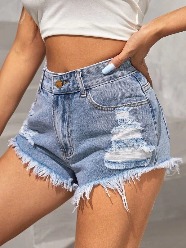 Details: Ripped, Raw Hem, Button, Pocket, Zipper