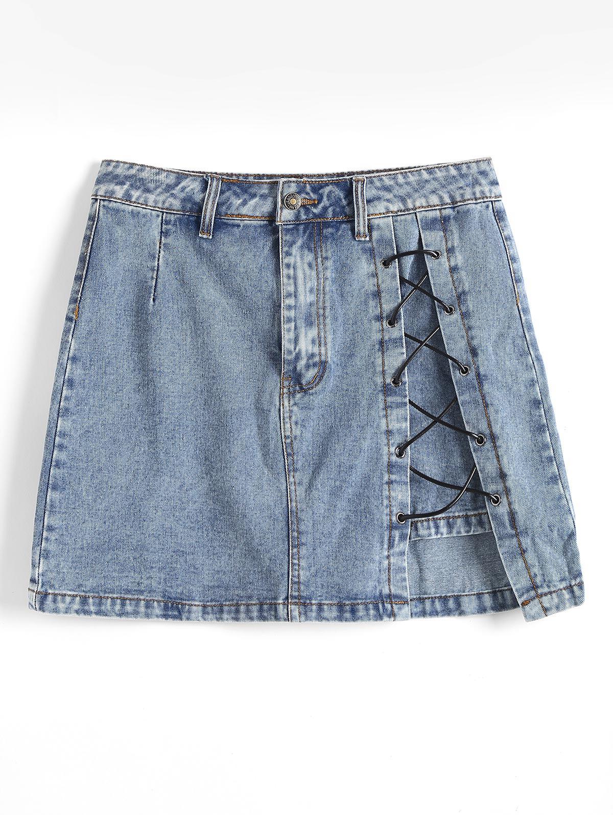 An elongated version of a classic A-line skirt, which is offered in medium-wash denim fabric and finished with an on-trend lace-up front with a sleek notched hem. To complete your look, tuck in a favorite button-down and add flat sandals.