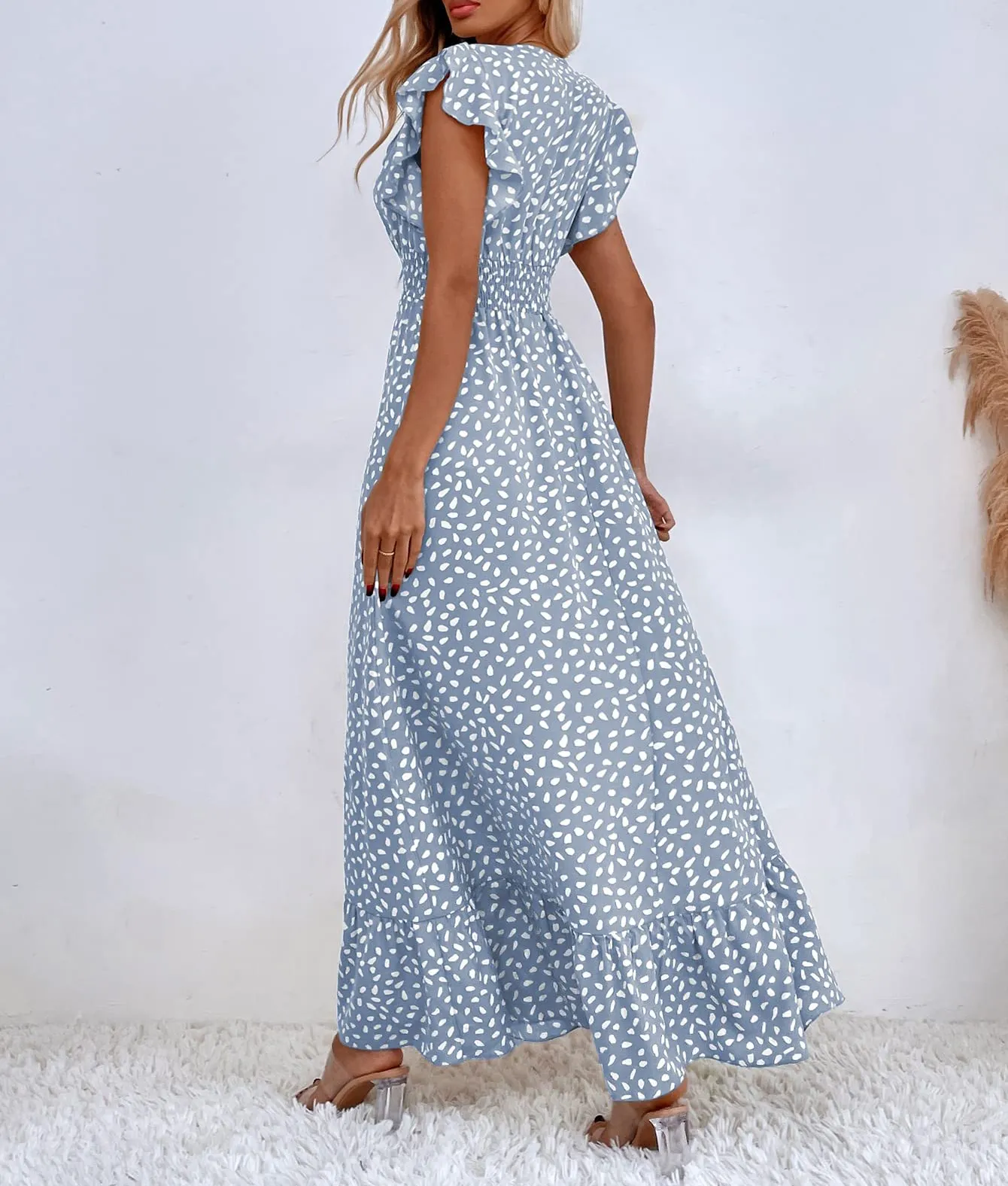 - Feature: cap sleeve, surplice neck, shirred waist, ruffle hem, printed, long length, vacation dresses for women